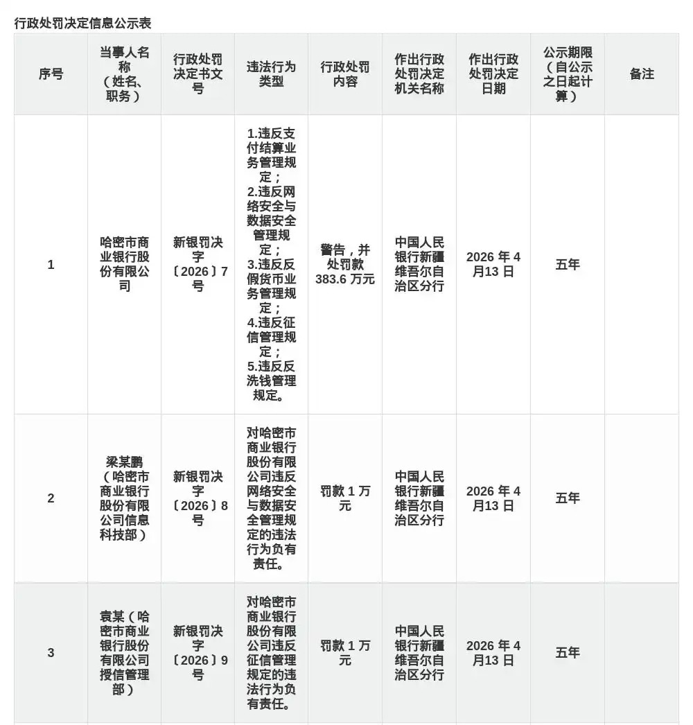 蓝鲸新闻4月19日讯,近日,中国人民银行新疆维吾尔自治区分行发布行政处罚信息,剑指哈密市商业银行股份有限公司及相关责任人。