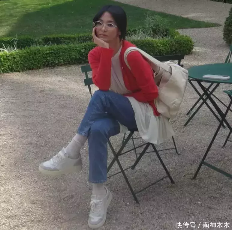 好巧不巧,宋慧乔还在社媒自曝了一系列近照,打扮格外放飞,红色开衫、白色内搭和细腿牛仔裤一上身,搭配上透明镜框圆眼镜,不止一位网友直呼宋慧乔好像我奶奶——她戴的真的不是老花镜吗?